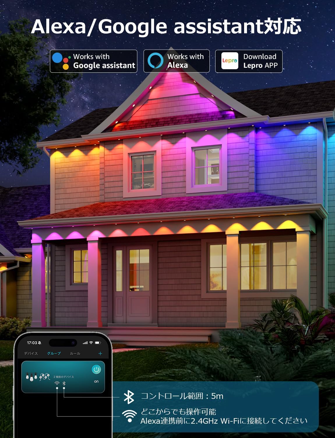 ![Lepro E1 AI ledストリングライト 60灯 30.6m AI照明デザイナー RGBCW+IC+昼光色+電球色 クリスマス 1600万色 調光調色 Alexa/Google Home対応 音楽同期 スマート スポットライト WiFi/Bluetooth対応 虹色 アドレサブル 間接照明 軒先 庭 3M両面テープ付 DIY 防水型【Leproアプリ アカウント登録要】[E1-60-JP]](http://jp.lepro.com/cdn/shop/files/81LawQv2j8L._AC_SL1500.jpg?v=1769153445&width=1445)