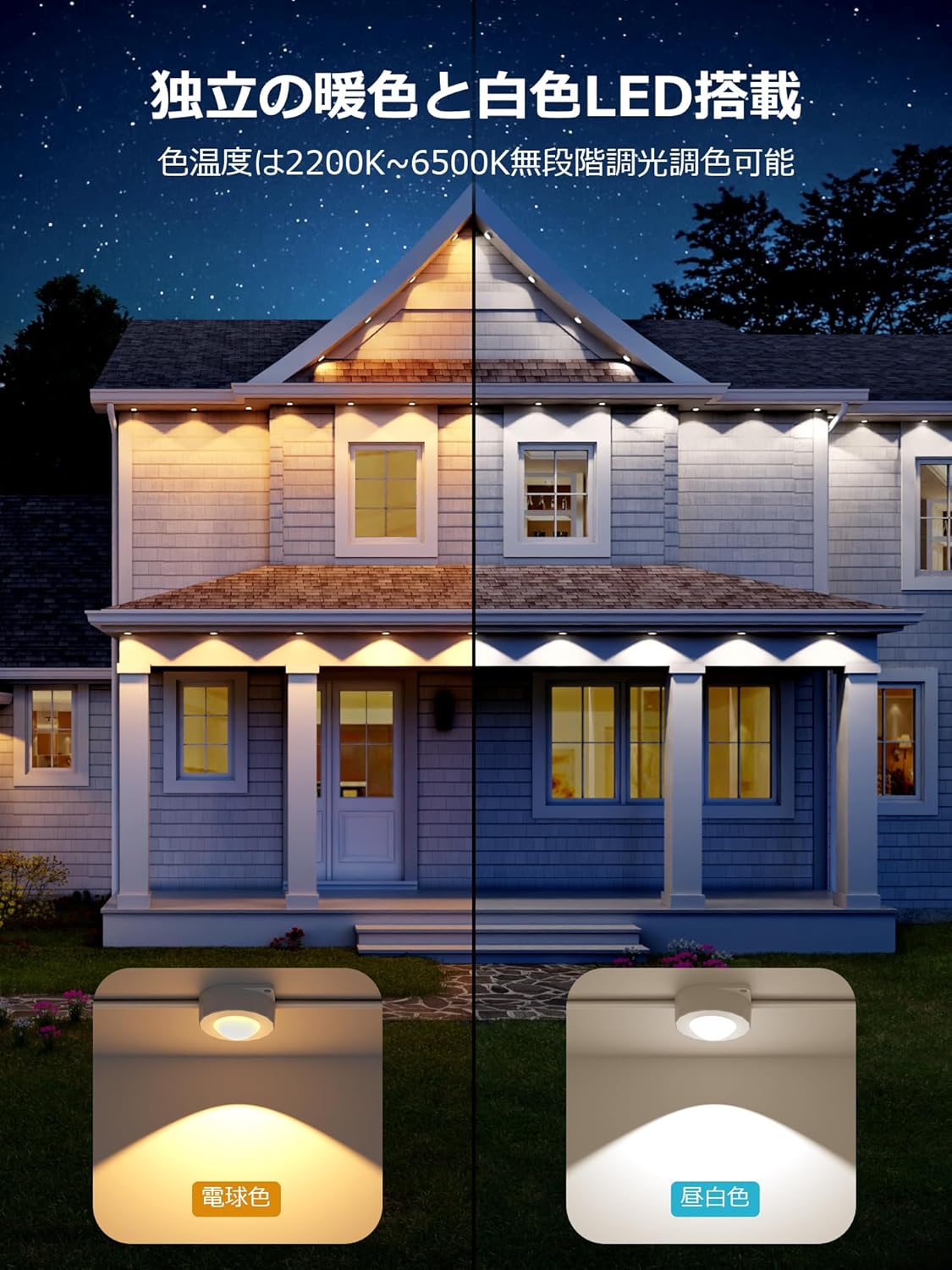 2200K〜6500K 調光可能な白色LED: 落ち着きのある電球色(2200K) から、クリアな昼白色(6500K) まで、あらゆるニュアンスの白を再現。アート照明にも防犯照明にも、雑色のない純正な光をご提供します。