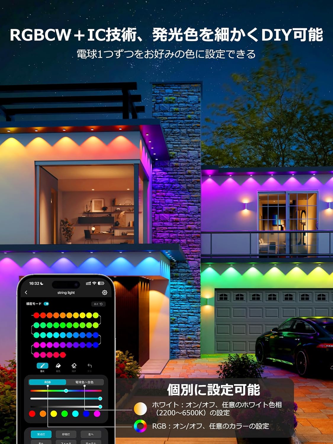 ①革命的な個別制御: 各LED電球は独立して制御可能。同じ灯りの中で、隣り合う電球ごとに自由に色を変え、エフェクトを設定できます。